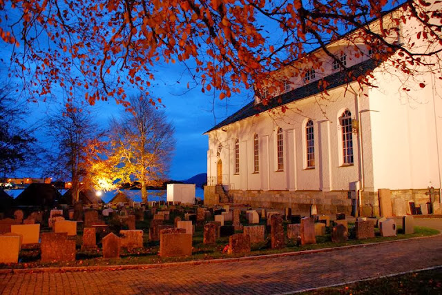 Last Sunday Svein went to the island of Stord and took some nighttime pictures of the Stord Church, a Lutheran church at Leirvik. It was built originally of brick in 1857, and restored in 1957. It has changed very little. The road to it is the same. The graveyard you see in Svein's pictures lies beyond the stone wall you see in the old picture above.