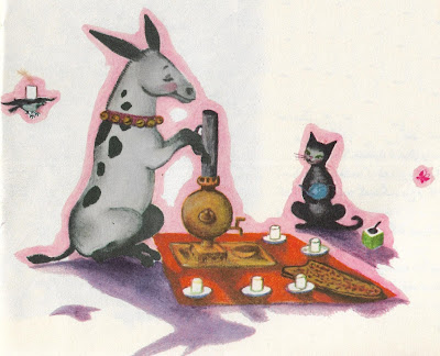The next morning, the woman was so tired that she woke up later than usual, but when she opened her eyes she saw that everyone was busy. The donkey lit the samovar, an urn for boiling water for tea, and put it on the tablecloth. The cat was making tea.